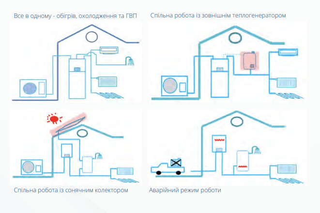 нагрівання ГВП, обігрів будинку, охолодження