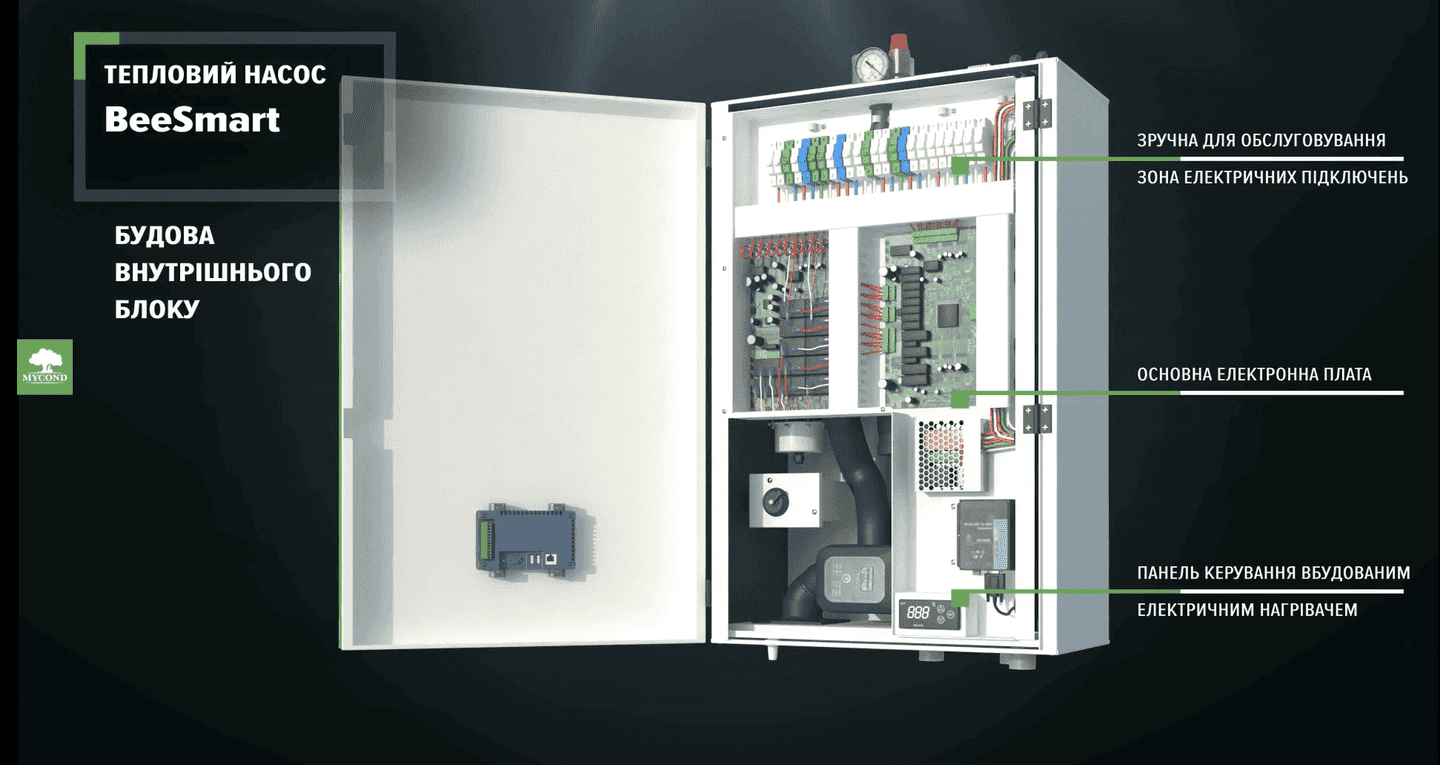 Mycond BeeSmart — це надійний тепловий насос з тепловою потужністю 15,35 кВт для опалення, охолодження та нагріву води. Регулятор забезпечує погодозалежне опалення/охолодження, комфортне гаряче водопостачання та керування додатковим джерелом тепла. Mycond BeeSmart розроблено для економії енергії з можливістю комбінування різного обладнання. Система контролю EcoTouch забезпечує оптимізацію енергоспоживання.