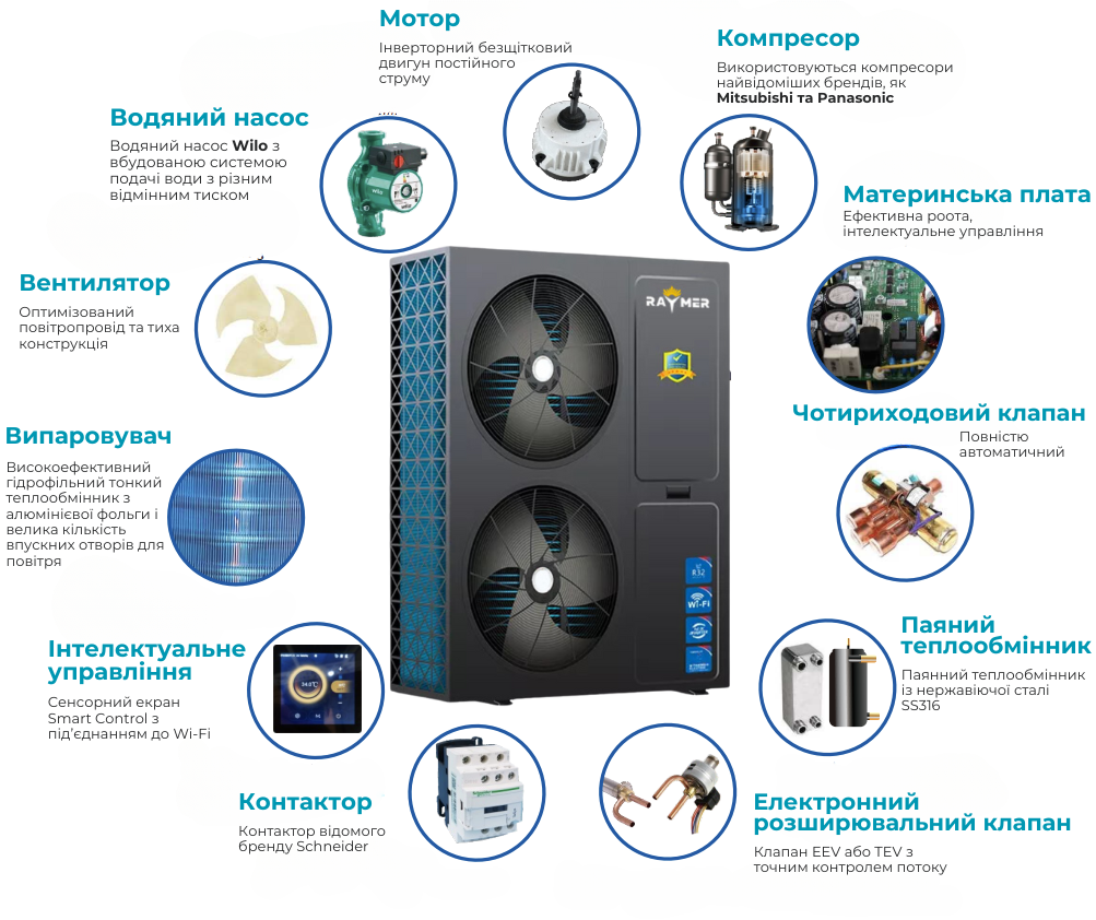 Завдяки застосуванню технологій Panasonic, тепловий насос Raymer відрізняється надійністю, стабільністю та преміальним рівнем енергоефективності, що робить його ідеальним вибором для сучасних енергонезалежних будинків.