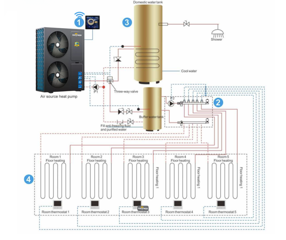 Система Raymer RAY-18MNG є частиною незалежної енергоефективної екосистеми, адже чудово поєднується з сонячними електростанціями (СЕС). У комплексі з інвертором та акумуляторами тепловий насос може працювати автономно, використовуючи відновлювану енергію сонця. Такий підхід дозволяє суттєво скоротити витрати на опалення та гаряче водопостачання, зменшити навантаження на електромережу й зробити будинок більш екологічним і незалежним від зовнішніх джерел енергії.