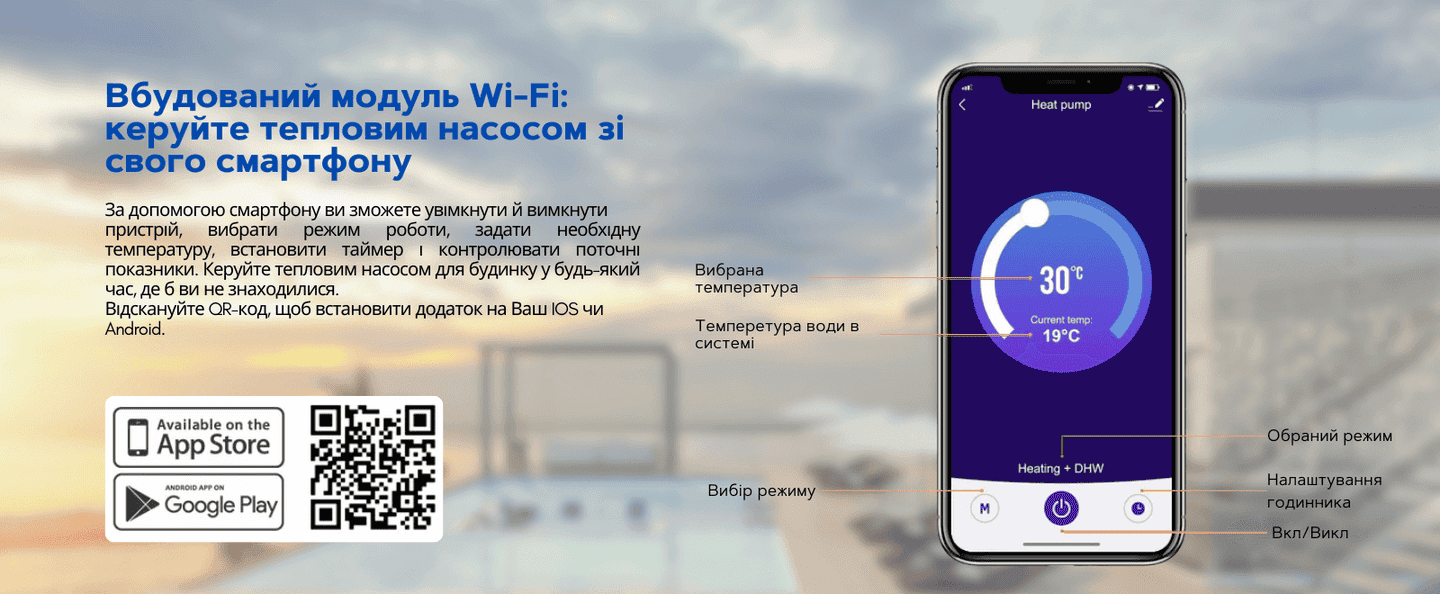 Wi-Fi керування, Висока температура на виході (до 60°C), Робота при -30°C