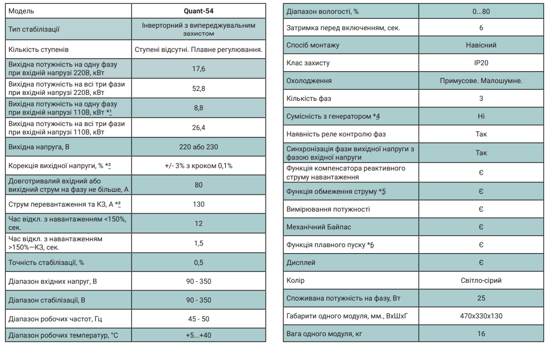 Трифазний стабілізатор напруги Quant-54 – це три однофазні інверторні стабілізатори напруги Quant-18, які працюють у парі з блоком контролю фаз. Головна відмінність трифазних стабілізаторів напруги Quant від звичайного трифазного стабілізатора із синхронізатором у тому, що він не блокує роботу однофазних споживачів навіть якщо з якихось причин відсутні дві фази.