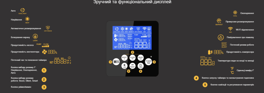 • Продуктивність компресора та температура води на вході та виході: Контролер надає докладні дані про ефективність роботи компресора та температуру води на вході та виході, що дозволяє контролювати процес нагріву або охолодження води в басейні з великою точністю.