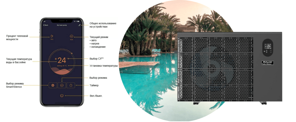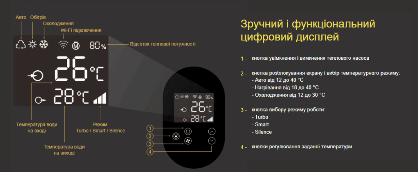Контролер з РК-дисплеєм: забезпечує ефективну і зручну експлуатацію. Функція блокування екрана захищає налаштування насоса, забезпечуючи безпеку його роботи. Контролер відображає дані про потужність насоса і вентилятора, забезпечуючи можливість діагностики проблем. Таймер дає змогу контролювати часові параметри роботи насоса. Підтримка Wi-Fi дає змогу під’єднати насос до смартфона для повідомлень про проблеми. Контролер надає інформацію про поточний режим роботи насоса і його ефективність, що забезпечує точний контроль над процесом нагрівання або охолодження води в басейні.