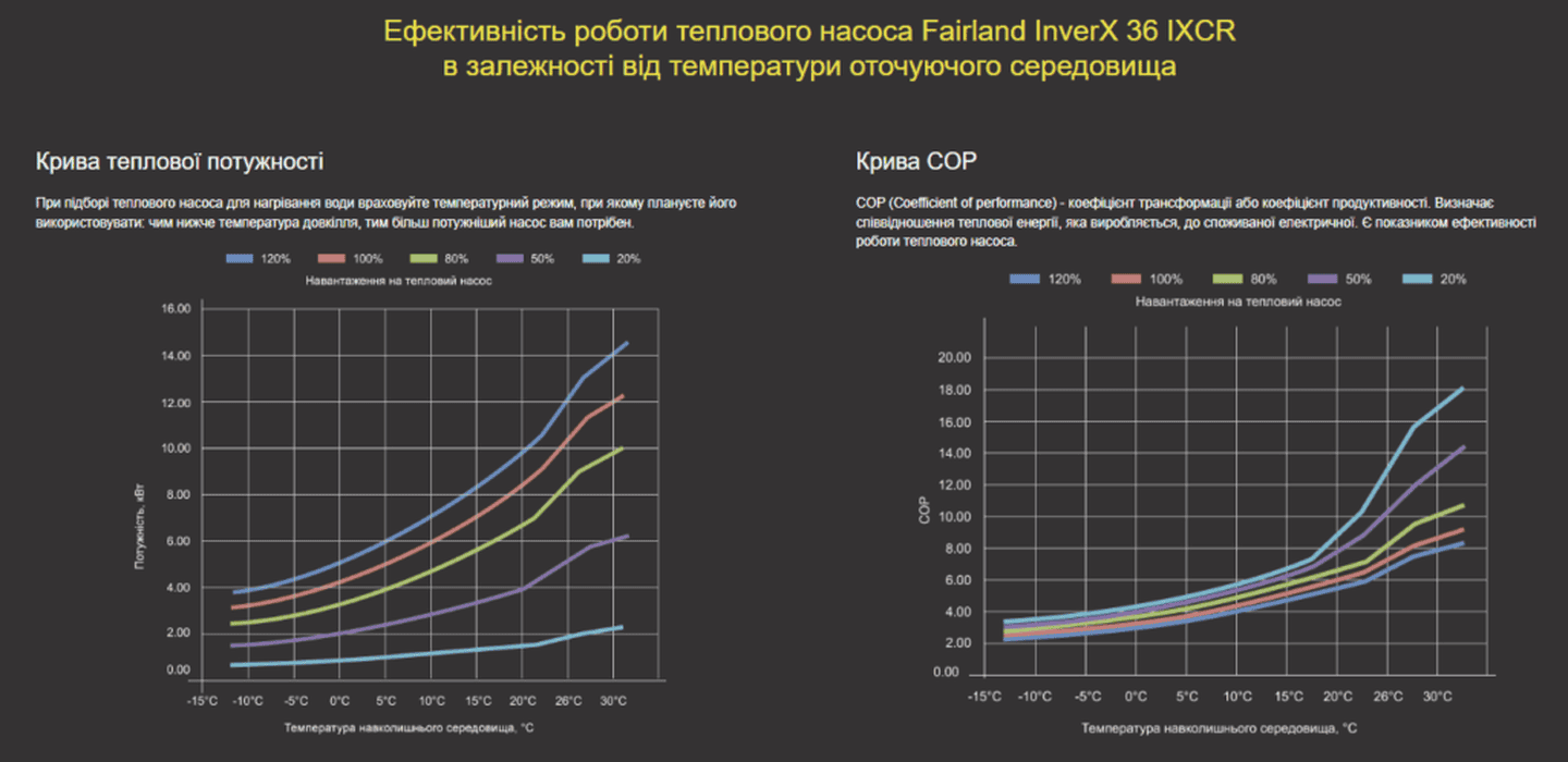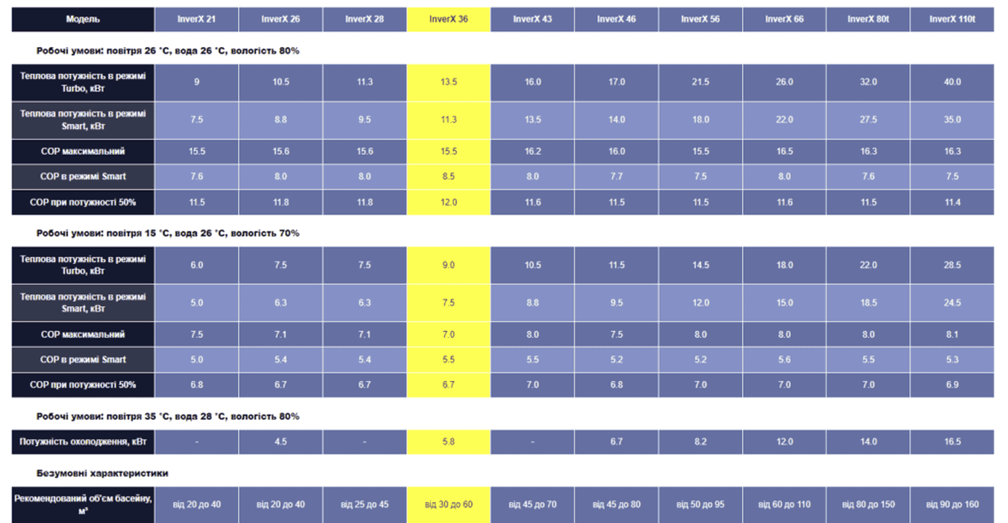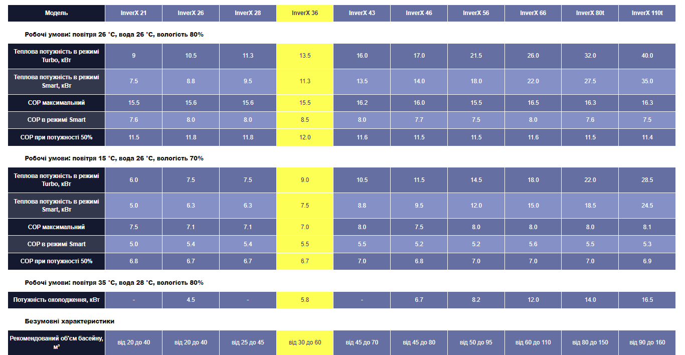 Режим Turbo: Теплопродуктивність: 120%. Цей режим призначений для швидкого нагріву води. Під час активації цього режиму насоси серії InverX виробляють додаткову енергію на 20%, забезпечуючи більш швидке нагрівання. При цьому насоси залишаються на рівні набагато тихішим, ніж звичайні інверторні насоси, і мають вищий коефіцієнт продуктивності (COP).