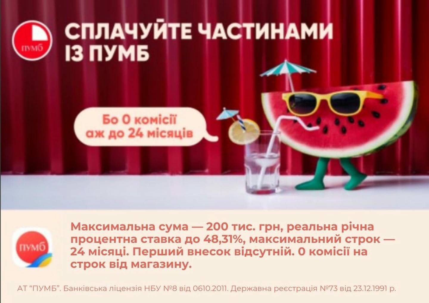 ![]() | Оплачивайте частями от ПУМБМаксимальная сумма кредита — 200 000 грн. Получите карту ПУМБ или откройте виртуальную в приложении ПУМБ Online и узнайте свой лимит (для получения карты перейдите на сайт www.pumb.ua).