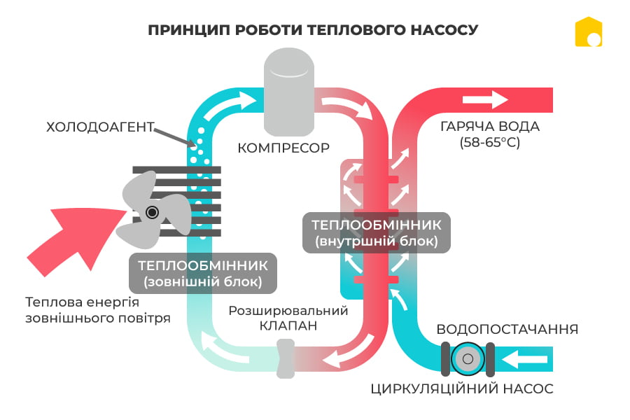 ⏩ Повышенная температура хладагента используется для нагрева воды в системе отопления и для подготовки горячей воды.
