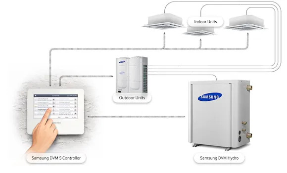 1. Управление: Система Samsung DVM Hydro обеспечивает возможность независимого или централизованного управления. Может работать автономно с использованием своей системы управления или интегрироваться с другими системами DVM с помощью контроллера Samsung DVM S.