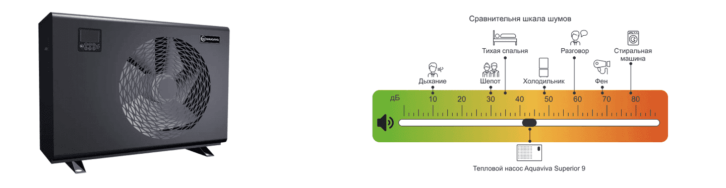 - Уменьшенный уровень шума: Благодаря использованию тихого инверторного компрессора и полноинверторной вентиляции, инверторный насос Aquaviva Superior 15 значительно тише обычных моделей. При достижении заданной температуры, насос переходит в режим экономии, используя 25-80% своей мощности, что позволяет существенно снизить уровень шума при его работе, обеспечивая комфортное использование.