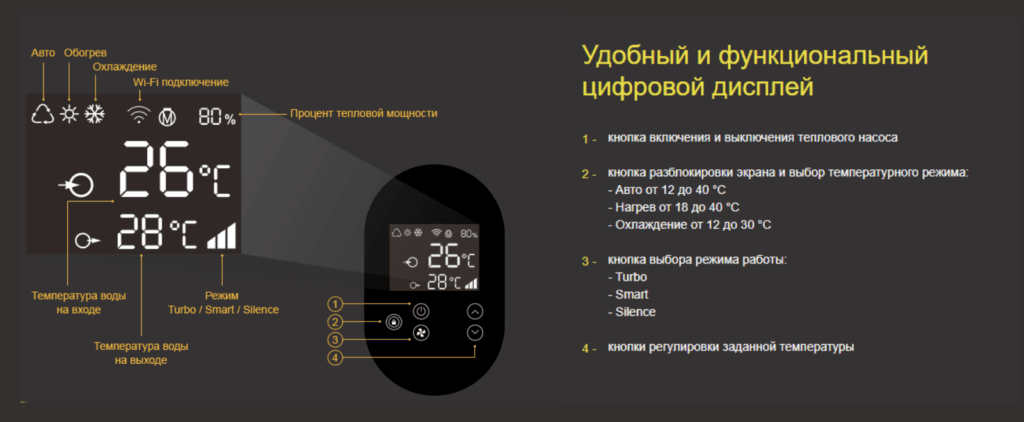 Контроллер с ЖК-дисплеем: обеспечивает эффективную и удобную эксплуатацию. Функция блокировки экрана защищает настройки насоса, обеспечивая безопасность его работы. Контроллер отображает данные о мощности насоса и вентилятора, обеспечивая возможность диагностики проблем. Таймер позволяет контролировать временные параметры работы насоса. Поддержка Wi-Fi позволяет подключить насос к смартфону для уведомлений о проблемах. Контроллер предоставляет информацию о текущем режиме работы насоса и его эффективности, что обеспечивает точный контроль над процессом нагрева или охлаждения воды в бассейне.