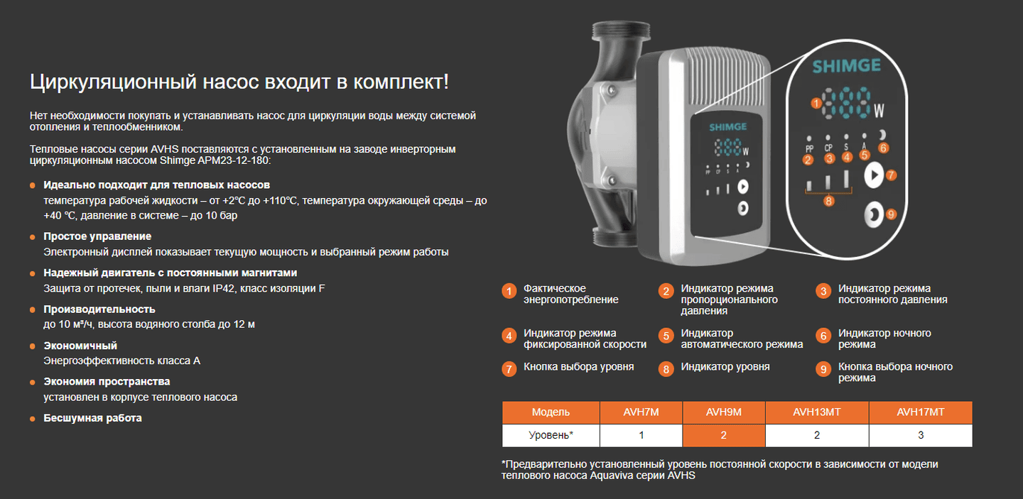 Тепловой насос Aquaviva AVH9M поставляется с встроенным циркуляционным насосом Shimge APM23-12-180, который обеспечивает эффективную циркуляцию теплоносителя. Он отличается высокой производительностью, низким энергопотреблением (класс энергоэффективности А) и компактностью.