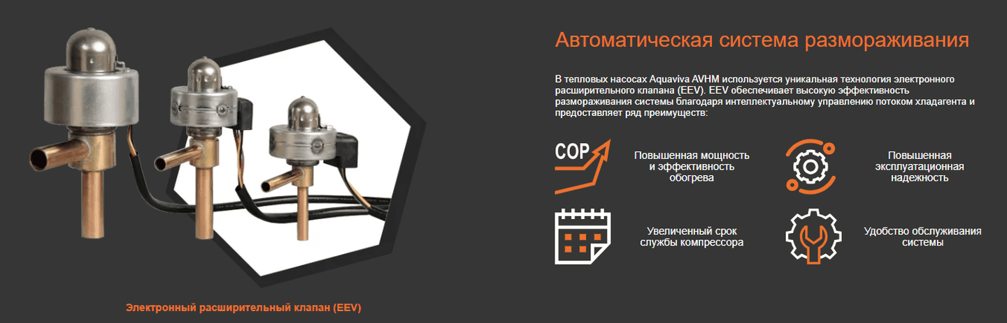 Технология EEV обеспечивает быструю и эффективную разморозку системы, а инновационный компрессор с инжекцией пара EVI расширяет диапазон работы и повышает эффективность при низких температурах.