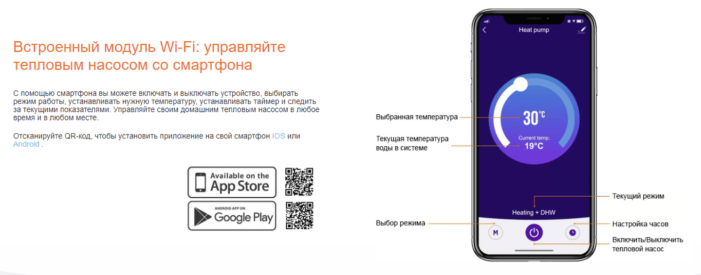 Управлять насосом можно с помощью смартфона: включение/выключение, выбор режимов, настройка температуры и мониторинг параметров возможны из любого места.