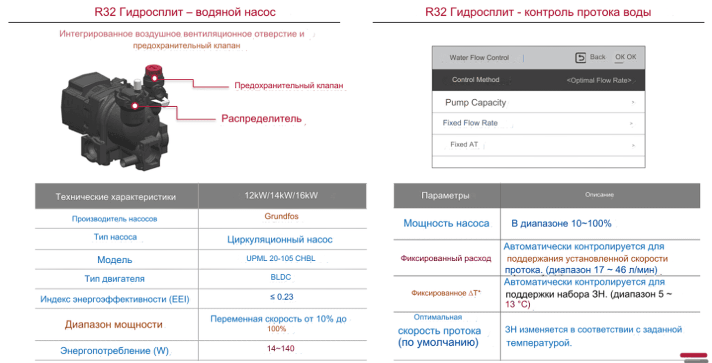 LG Therma V Hydrosplit использует насос Grundfos с продвинутыми параметрами управления, что позволяет изменять скорость потока воды в соответствии с тепловой нагрузкой, делая систему еще более эффективной.
