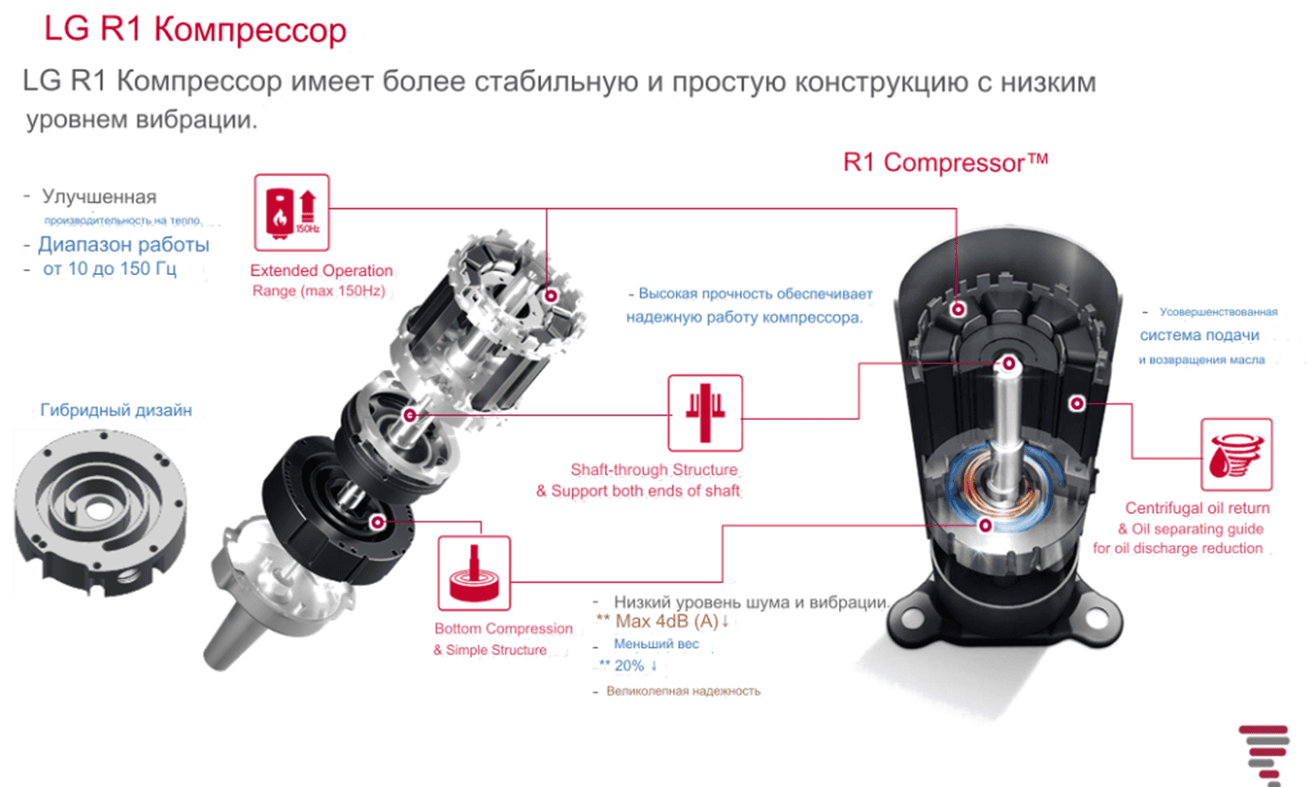 Компрессор R1 — это первый в мире гибридный спиральный компрессор с мгновенным впрыском и сквозной конструкцией вала. Он обеспечивает высокую эффективность, надежность и стабильность работы, сниженный уровень шума и более широкий рабочий диапазон по сравнению с традиционными компрессорами.