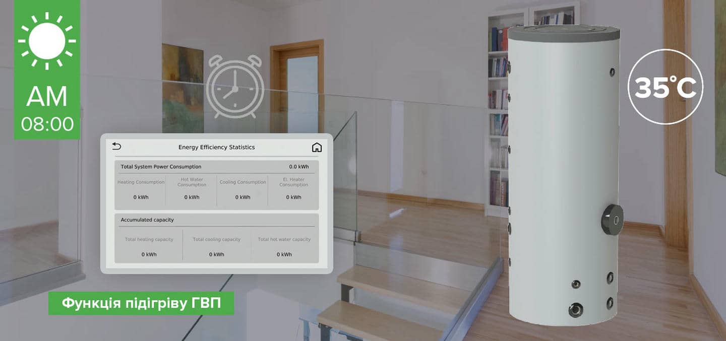 Управление тепловым насосом осуществляется через 7-дюймовый сенсорный экран EcoTouch, который предоставляет простой и интуитивно понятный интерфейс для пользователя. Контроллер позволяет управлять всей системой отопления, включая отопление, охлаждение и горячее водоснабжение, с помощью погодозависимого режима. Эта функция позволяет регулировать температуру теплоносителя в зависимости от внешних условий, что гарантирует максимальный комфорт и экономию энергии.