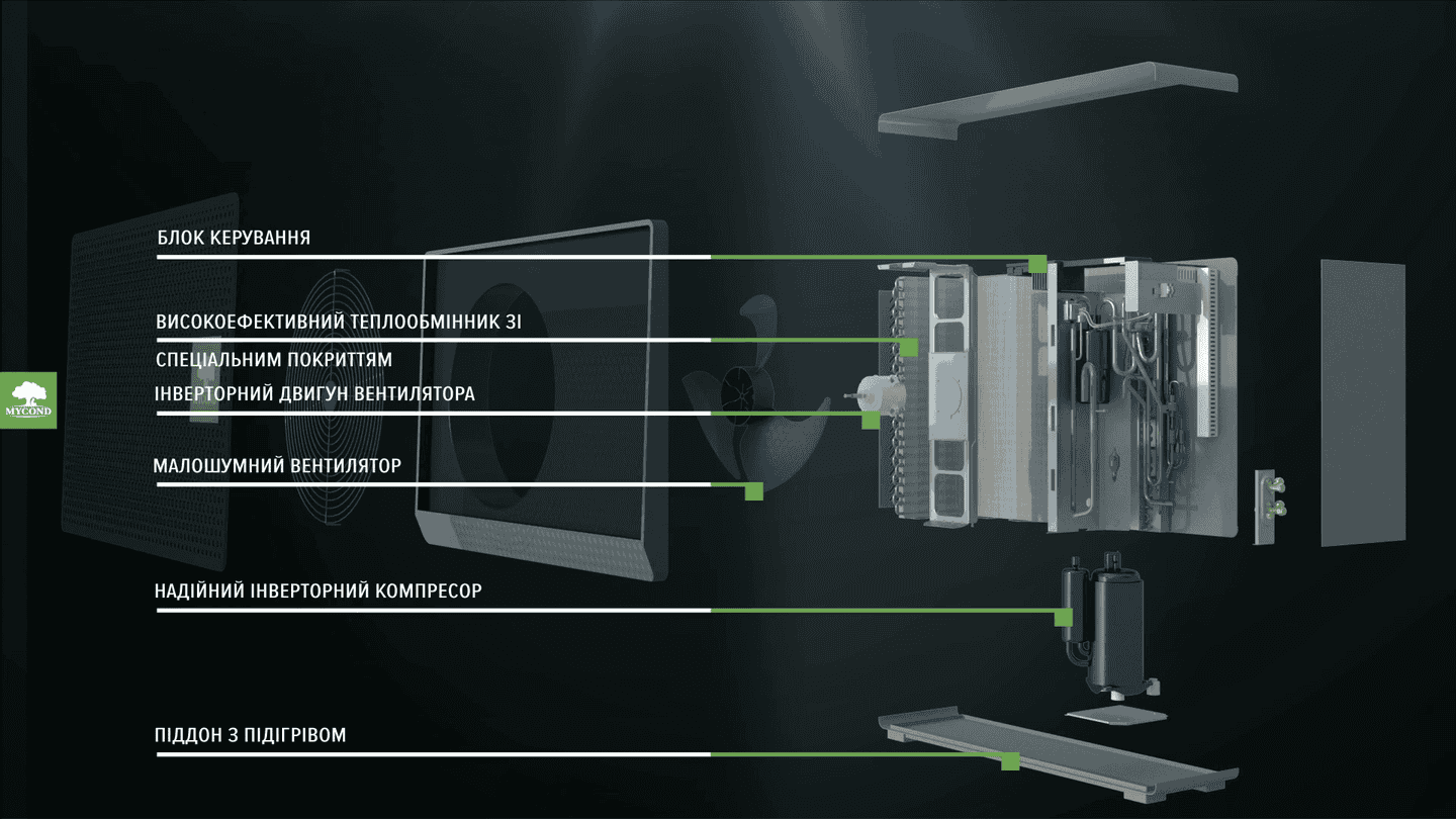 3. Инверторный тепловой насос Mycond BeeSmart All-in-One MHCS035UBS/MHCS035/045DTS, до -25°C, сплит-система до 100 м², со встроенным баком для ГВС
