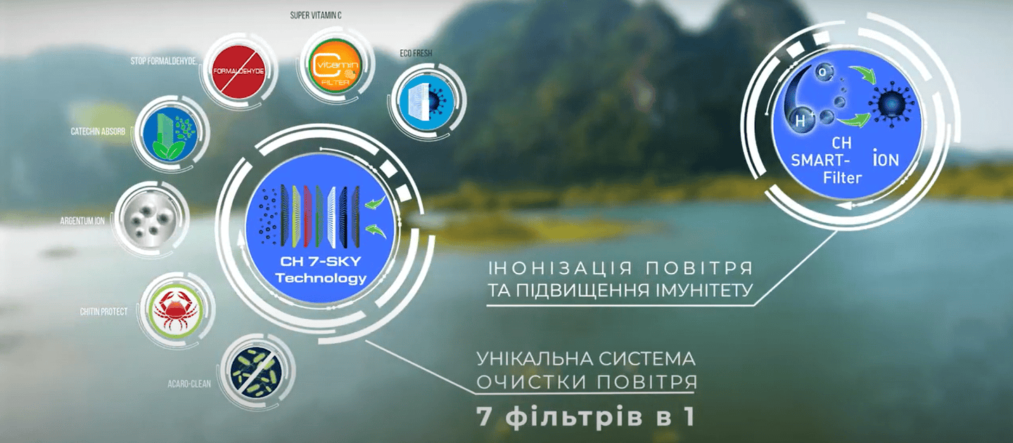 • CH 7-SKY Technology — многоступенчатая система очистки воздуха на основе 7 фильтров, которые задерживают широкий спектр загрязнений, включая пыль, аллергены и неприятные запахи.