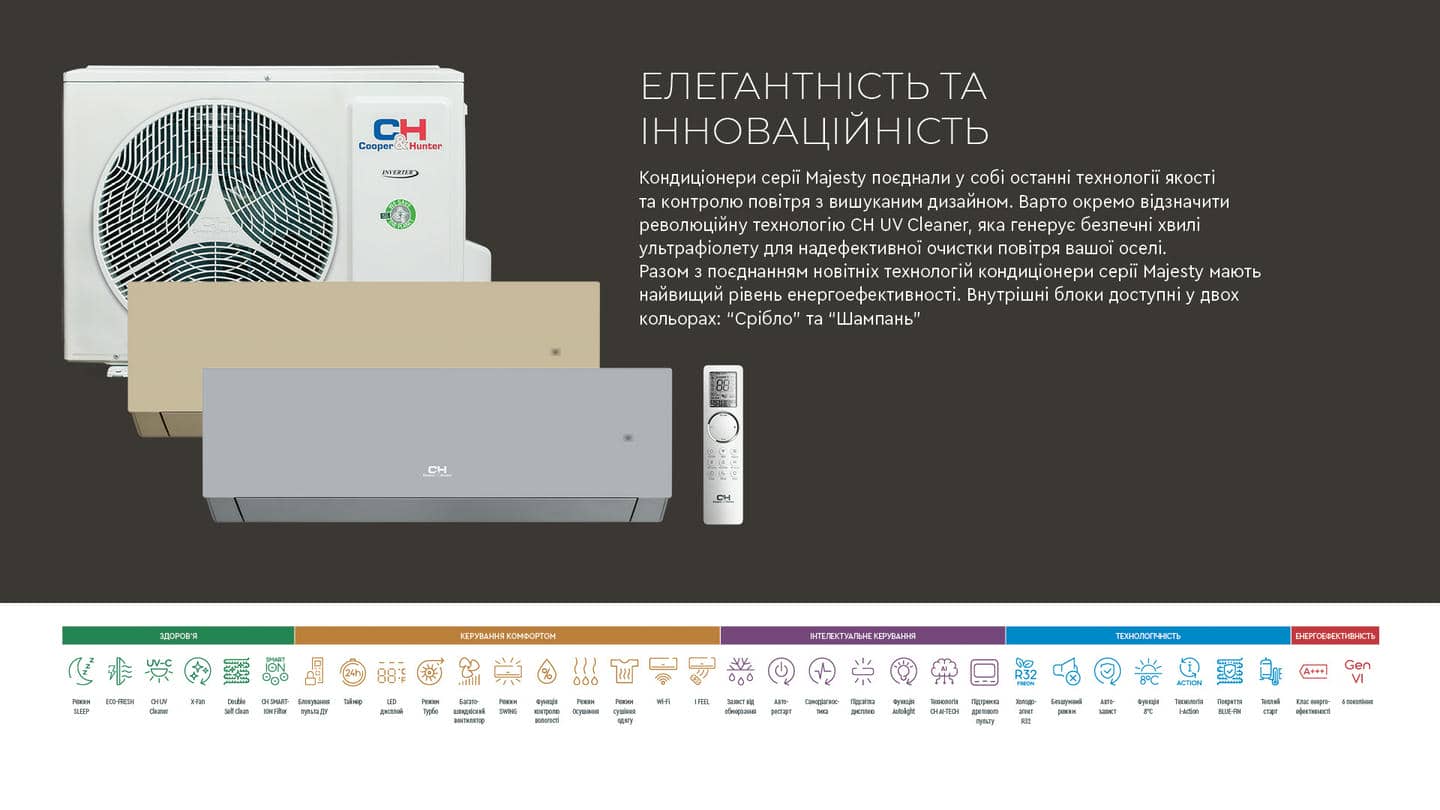 Cooper&Hunter Majesty — это инновационный кондиционер премиум-класса, который сочетает в себе передовые технологии, высокую энергоэффективность и стильный дизайн. Благодаря инверторной системе, технологии ультрафиолетовой очистки воздуха, функции самоочистки и ионизации, устройство обеспечивает комфортный микроклимат и чистоту воздуха в помещении.