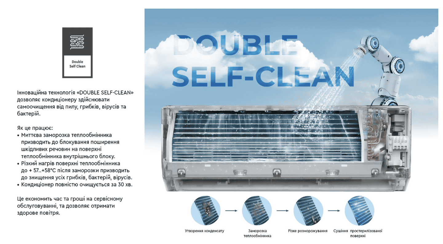 Эта функция обеспечивает автоматическую самоочистку внутреннего блока кондиционера. Сначала происходит замораживание теплообменника, что предотвращает распространение грибков и бактерий, а затем резкий нагрев до +58°C, который уничтожает все вредные микроорганизмы. Это гарантирует долговечную работу устройства и уменьшает необходимость в сервисном обслуживании.