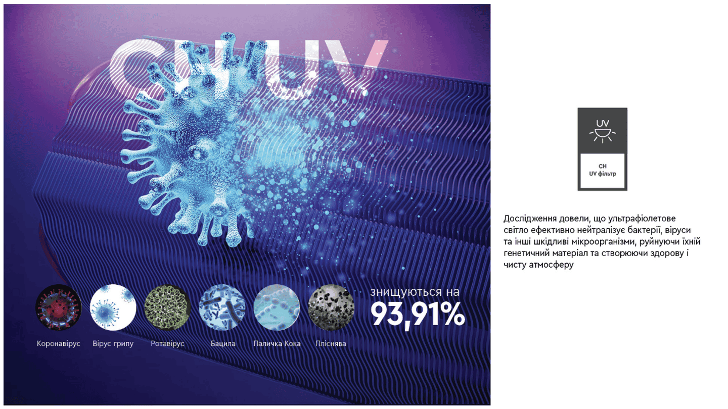 Система ультрафиолетовой очистки воздуха эффективно уничтожает бактерии, вирусы и другие микроорганизмы. Ультрафиолетовое излучение разрушает структуру вредных частиц, гарантируя чистый, безопасный и здоровый воздух в помещении.