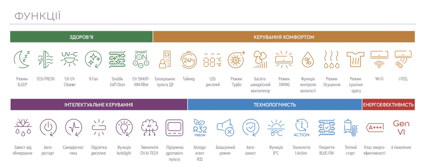 Технология ECO Fresh/ Технология CH Smart Ion/ Функция самоосушения/ Технология CH-UV/ Функция самоочистки/ Авторестарт/ Автозащита