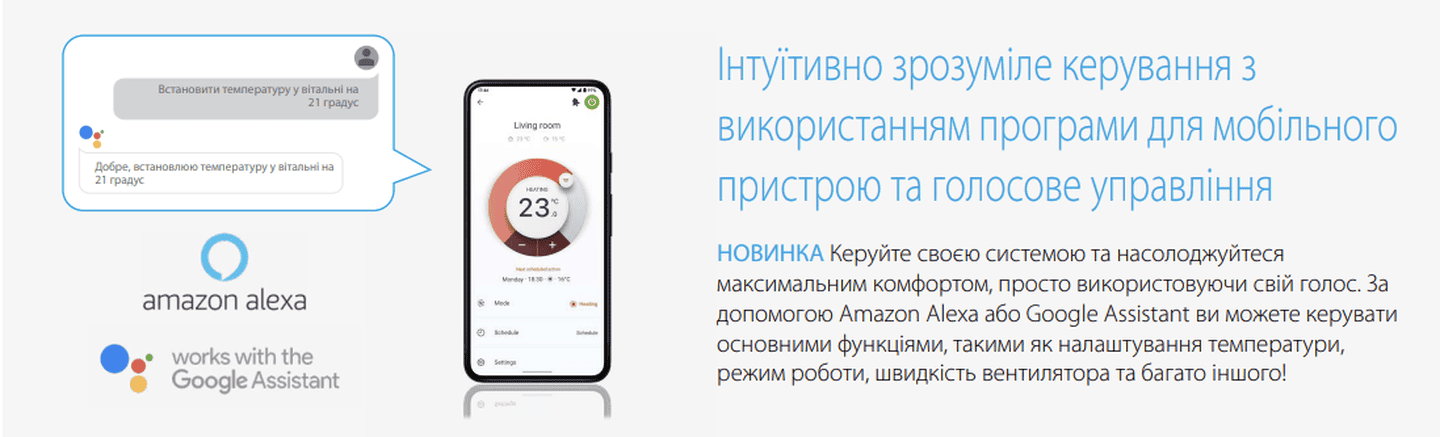 Голосовое управление: Поддержка Amazon Alexa и Google Assistant позволяет изменять настройки с помощью голосовых команд: включение/выключение, изменение температуры, скорости вентилятора и прочее.