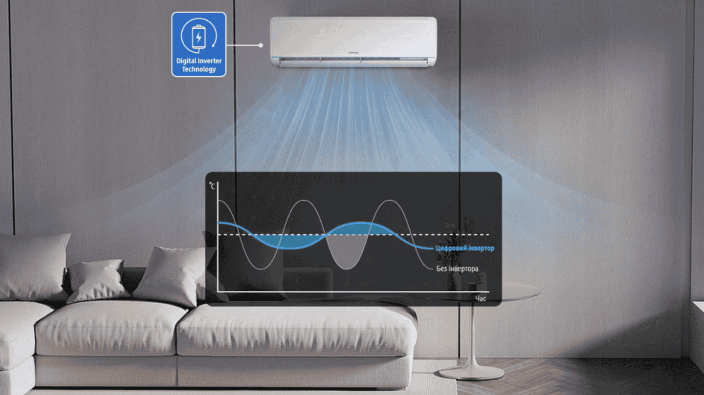 Инверторный компрессор Digital Inverter 4-Pole: Поддерживает желаемую температуру, уменьшая потребность в частых включениях и выключениях, что значительно снижает потребление электроэнергии и обеспечивает длительную работу устройства.