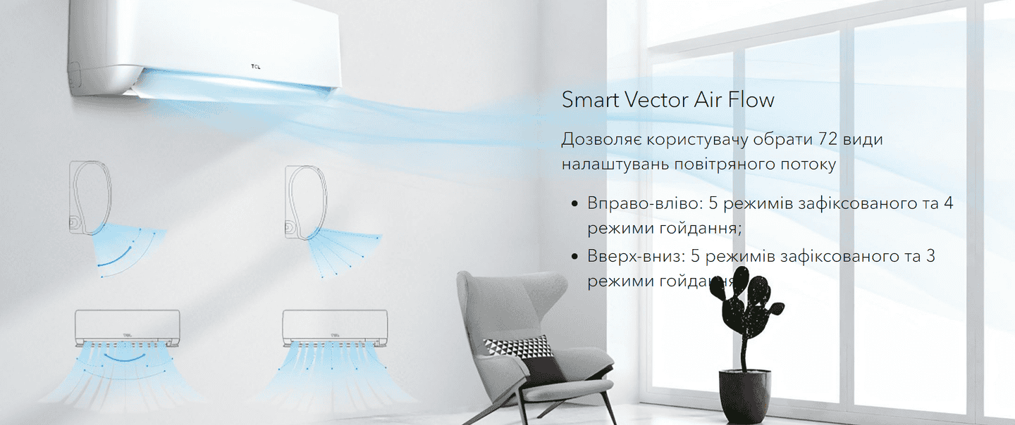 Умный поток воздуха обеспечивает оптимальное распределение воздуха в зависимости от выбранного режима. В режиме охлаждения прохладный воздух направляется вверх, избегая прямого потока к голове пользователя. Это позволяет предотвратить неприятные ощущения от сильного охлаждения. В режиме обогрева воздух направляется вниз, на ноги, что создает приятный и комфортный обогрев помещения. Такой подход обеспечивает более естественное распределение тепла или холода в помещении, что способствует равномерному температурному балансу и комфорту без излишнего энергопотребления.