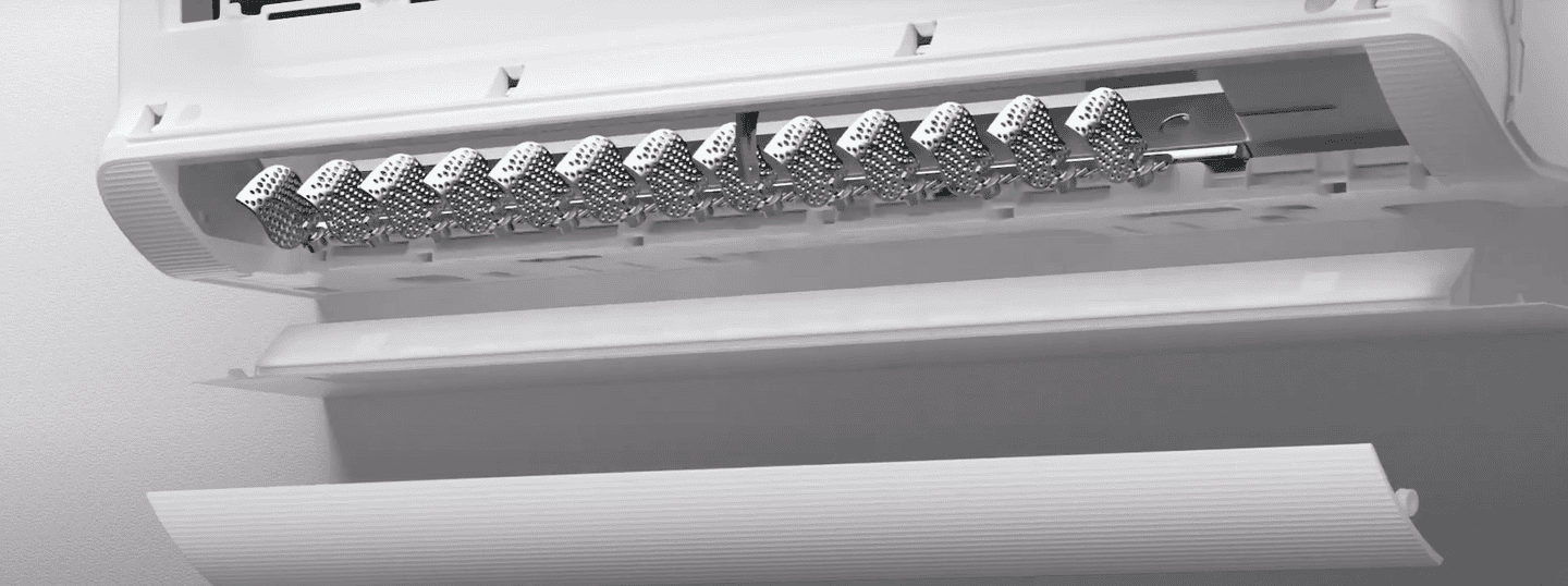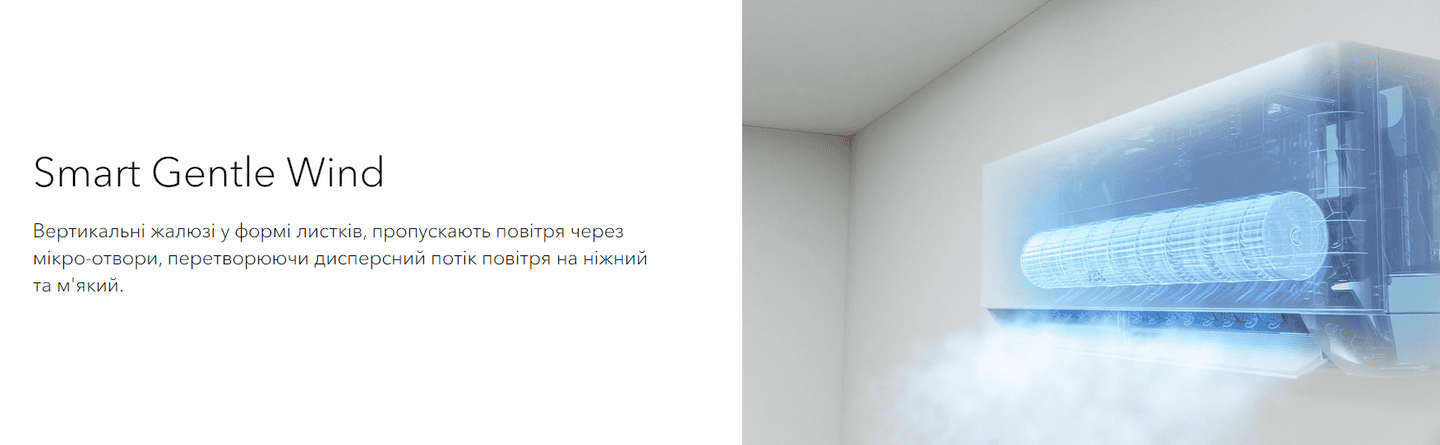Технология Smart Gentle Wind создает приятный и равномерный поток воздуха, обеспечивающий максимальный комфорт для пользователя. Особенность системы заключается в наличии микро-отверстий на жалюзи, которые направляют поток воздуха таким образом, что он не дует прямо на человека, а рассеивается более мягко. Это позволяет избежать дискомфорта от прямого воздействия холодного или горячего воздуха, создавая приятную атмосферу в комнате. Такое равномерное распределение воздуха особенно подходит для спален или детских комнат, где важен комфорт и уют без резких изменений температуры.