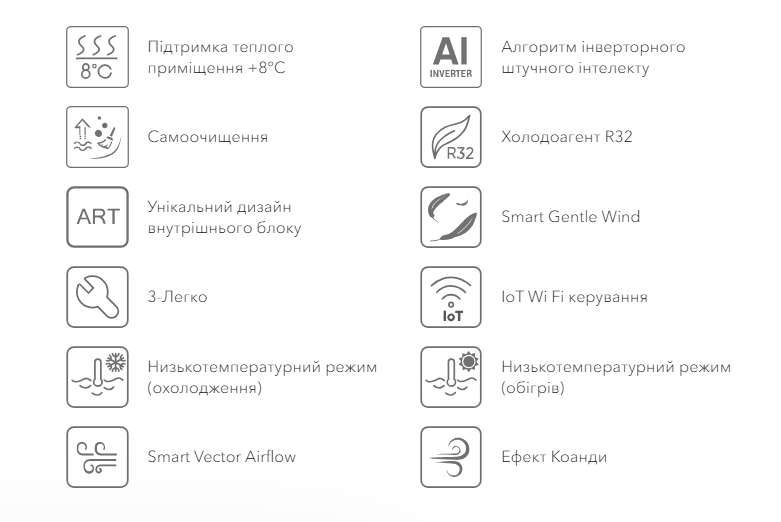 выбор режимов работы, самоочистка, wi-fi управление, турбо режим, Smart Vector Airflow, автоматический перезапуск, дисплей, запоминания настроек, запуск при низких температурах наружного воздуха, защита дома от обледенения +8°C, интеллектуальная разморозка, конструкция жалюзи "нежный ветер", ночной режим работы, покрытие теплообменника Blue Fin, самодиагностика, старт при низком напряжении, таймер 24 часа, теплый старт, функция I FEEL, эффект Коанди, интеллектуальный ЭКО режим, пульт ДУ