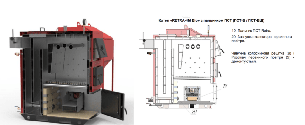 Горелка совкового типа. Демонтируется боковой люк котла на место которого устанавливается горелка ПСТ которого устанавливается горелка ПСТ, топливо подается из бункера шнеком горелки, сгорание происходит в нижней камере. Этот автоматический режим загрузки предназначен для сжигания пеллет, щепы и агроотходов. Для работы котла в этом режиме рассекатель первичного воздуха и чугунная колосниковая решетка демонтируются, вентиляторы первичного и вторичного воздуха котла не используются (действует только вентилятор который установлен на горелке ПСТ), на место рассекателя первичного воздуха устанавливается заглушка. Процесс горения контролирует блок управления который идет в комплектации горелки. Золоудаление ручное, с помощью зольного ящика, или автоматическое (по заказу).