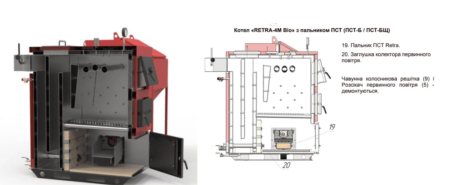 Горелка совкового типа. Демонтируется боковой люк котла на место которого устанавливается горелка ПСТ которого устанавливается горелка ПСТ, топливо подается из бункера шнеком горелки, сгорание происходит в нижней камере. Этот автоматический режим загрузки предназначен для сжигания пеллет, щепы и агроотходов. Для работы котла в этом режиме рассекатель первичного воздуха и чугунная колосниковая решетка демонтируются, вентиляторы первичного и вторичного воздуха котла не используются (действует только вентилятор который установлен на горелке ПСТ), на место рассекателя первичного воздуха устанавливается заглушка. Процесс горения контролирует блок управления который идет в комплектации горелки. Золоудаление ручное, с помощью зольного ящика, или автоматическое (по заказу).