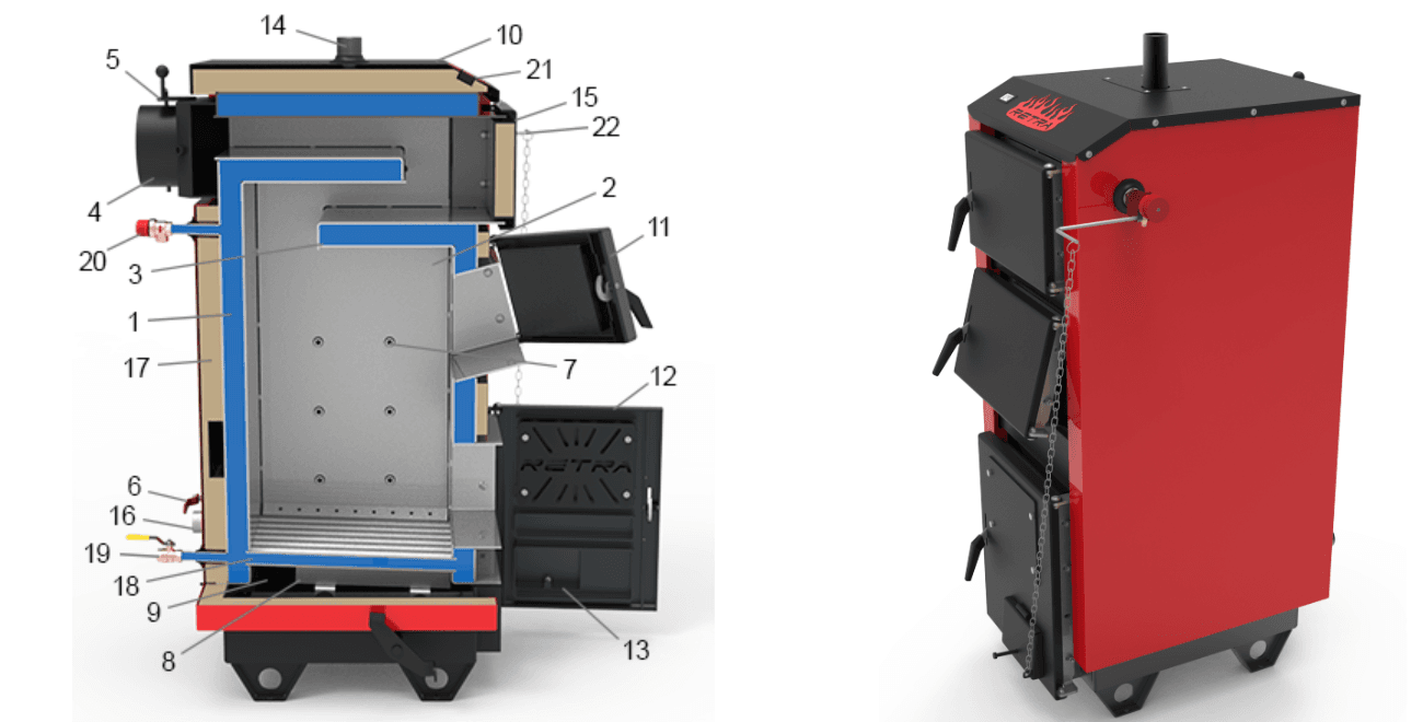 1. стальной теплообменник; 2. камера сгорания (топка); 3. перегородка прямая; 4. дымоход; 5. шибер газохода поворотный; 6. шибер для регулирования вторичного воздуха; 7. форсунки вторичного воздуха; 8. разрыхлитель топлива; 9. камера поддувала (зольник); 10. кожух декоративный; 11. кожух декоративный; 11. люк загрузочный; 12. люк выгребной и удаления пепла; 13. люк поддувала; 14. патрубок подачи; 15. люк для чистки дымовых каналов; 16. патрубок оборота; 17. слой теплоизоляции; 18. решетка колосниковая; 19. патрубок сливной с шаровым краном; 20. клапан предохранительный; 21. термометр; 22. регулятор тяги.