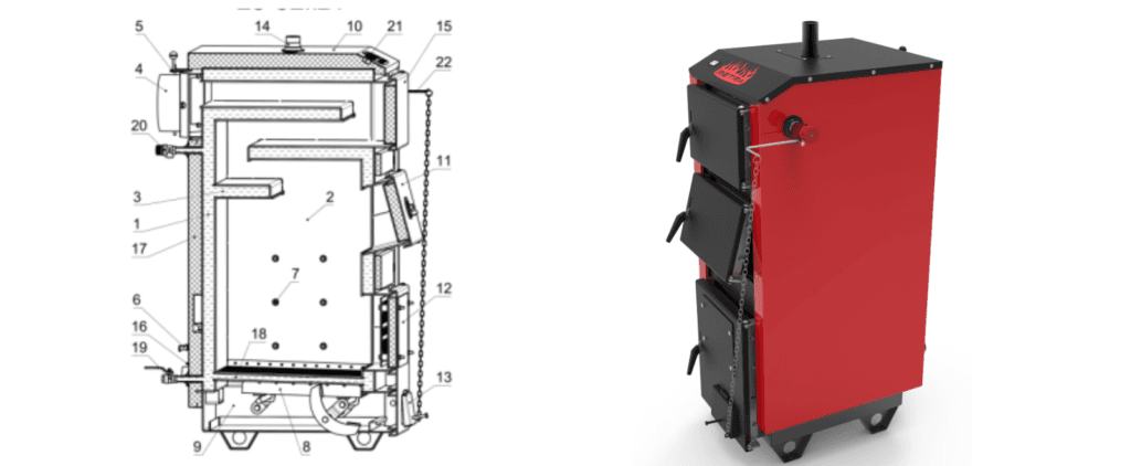 1. стальной теплообменник; 2. камера сгорания (топка); 3. перегородка прямая; 4. дымоход; 5. шибер газохода поворотный; 6. шибер для регулирования вторичного воздуха; 7. форсунки вторичного воздуха; 8. разрыхлитель топлива; 9. камера поддувала (зольник); 10. кожух декоративный; 11. кожух декоративный; 11. люк загрузочный; 12. люк выгребной и удаления пепла; 13. люк поддувала; 14. патрубок подачи; 15. люк для чистки дымовых каналов; 16. патрубок оборота; 17. слой теплоизоляции; 18. решетка колосниковая; 19. патрубок сливной с шаровым краном; 20. клапан предохранительный; 21. термометр; 22. регулятор тяги.