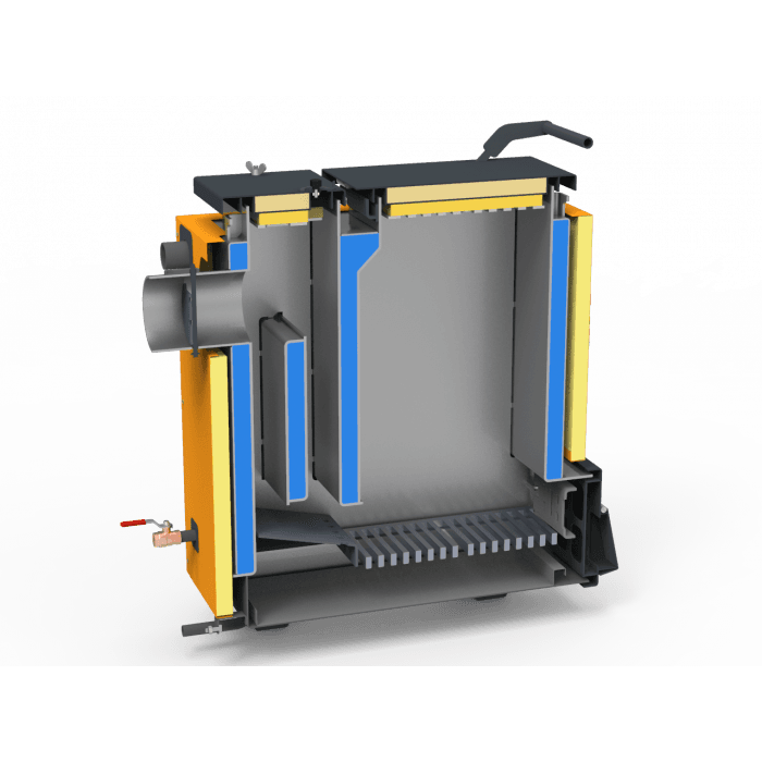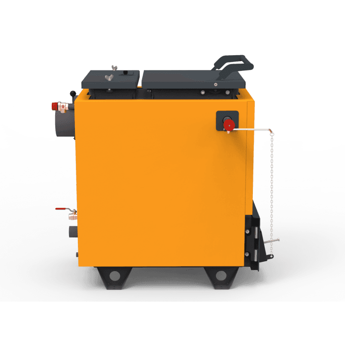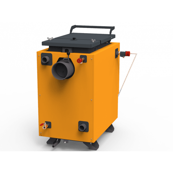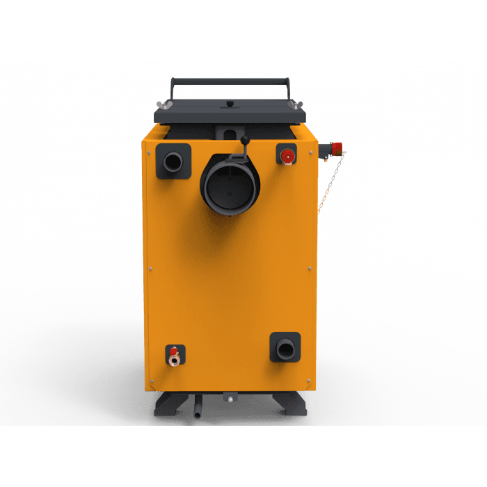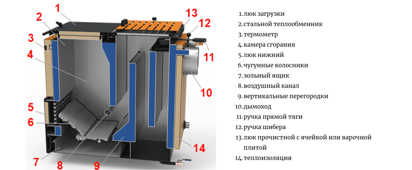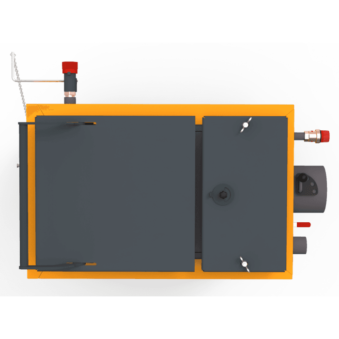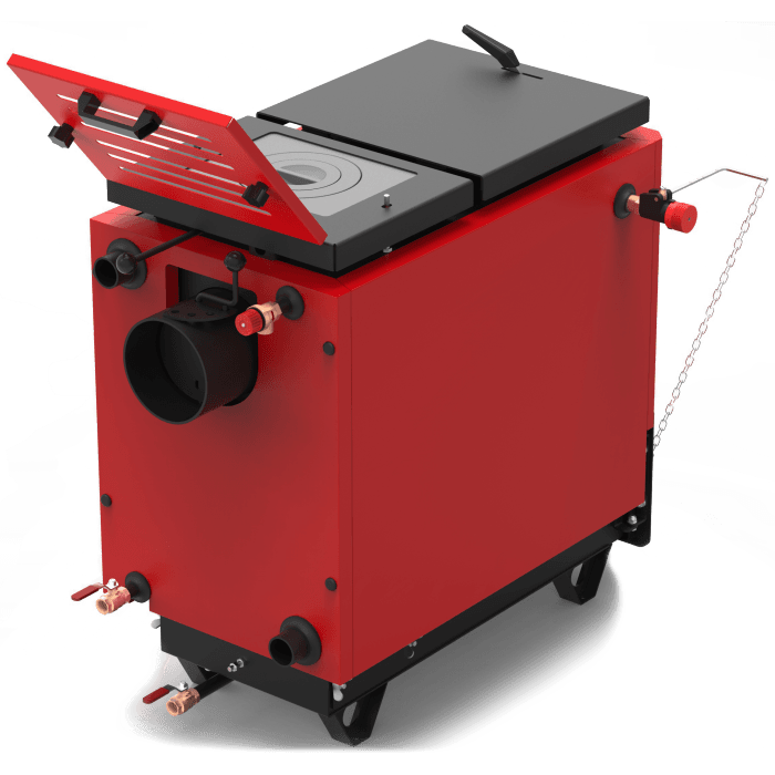 На передней стороне котла размещен шуровочный люк (для шуровки топлива и удаления золы) с поддувалом и термометр. На верхней стороне котла находится люк загрузки, люк для читки дымовых каналов со смотровым окошком. На задней стороне котла находятся дымоход с шибером газохода поворотным, патрубки оборота и подачи, ручка прямой тяги. В нижней боковой части котла размещены два люка (справа и слева) для удаления сажи и мелкодисперсной золы.