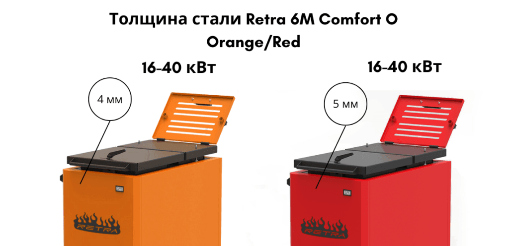 Материал теплообменника: качественная котловая сталь 4 мм (Orange) и 5 мм (Red).