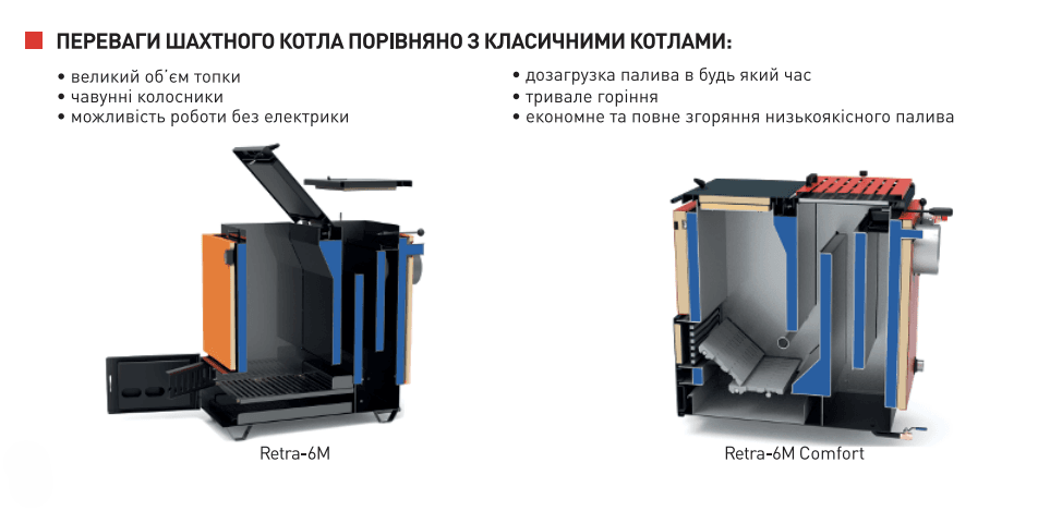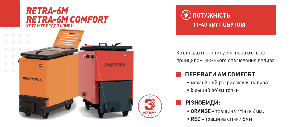 Для котлов «Retra-6М Comfort» предусмотрено место для установки электротэна. Принцип действия, по которому работают отопительные котлы, на которому работают отопительные котлы на твердом топливе и электричестве: твердое топливо служит постоянным видом топлива, на нем агрегат работает постоянно. В случае, если древесина сгорела, а новая загрузка топлива не производится. Температура теплоносителя в рубашке начинает падать, на что реагирует соответствующий датчик. Он подает сигнал на блок управления тот включает электрический обогреватель (электротен). Далее теплоноситель в системе отопления нагревается исключительно электричеством, пока в камеру сгорания не загрузят новую порцию топлива. После ее прогрева блок управления отключит электротен и котел снова полностью перейдет на основной режим работы.