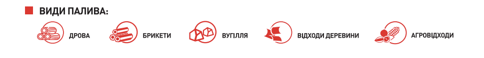 Топливо: уголь, брикеты, древесина, стружка, опилки, кора с влажностью до 30%.