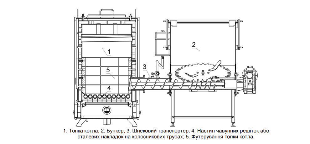 При механизированном режиме работы котла топливо из бункера подается в топку котла шнековым транспортером. Процесс горения происходит на колосниковых трубах. Необходима установка на колосниковых трубах настила из чугунных решеток или стальных накладок, чтобы не допустить просыпания мелкофракционного топлива. Также рекомендуется футеровка топка для более качественного сжигания топлива.