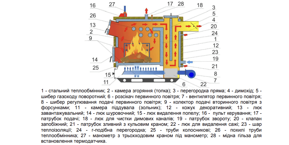 В нижней боковой части котла находятся два люка (справа и слева) для удаления сажи и мелкодисперсной золы. Между теплообменником и декоративным кожухом размещен слой теплоизоляции.