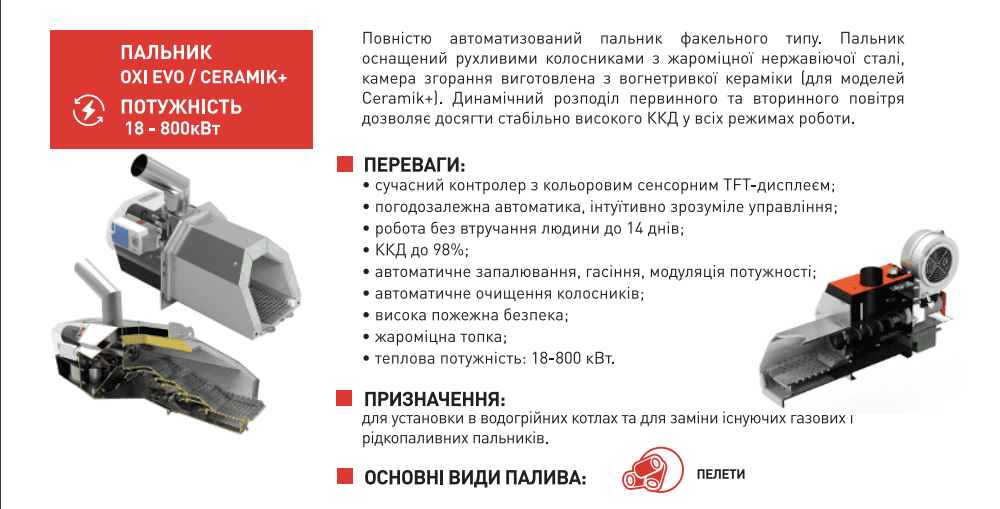 Факельная горелка усовершенствованный способ автоматической очистки, обеспечивающий поддержание неизменных условий горения в течение всего периода работы. Уникальная система распределения воздуха и дожигания газов обеспечивает эффективное сгорание топлива. Горелки оборудованы подвижной колосниковой решеткой, которая обеспечивает работу в практически автоматическом режиме в течение даже нескольких месяцев, в зависимости от качества топлива. Конструкция горелки дает возможность свободного выбора места ее установки — в двери котла или в корпус. Горелка позволяет сжигать сыпучую и гранулированную биомассу всех видов, независимо от ее качества, в том числе промышленную и соломенную пеллету.