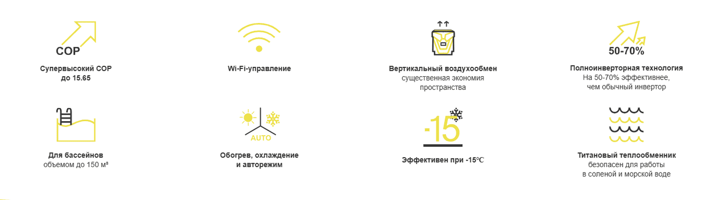 Технология Full Inverter обеспечивает адаптивную работу компрессора, вентилятора и электроники, что позволяет насосу работать только на необходимой мощности без перерасхода энергии. В среднем COP составляет 6,14–15,65, что означает: на каждый киловатт потребляемой электроэнергии насос производит до 15,65 кВт тепловой энергии. Это значительно снижает эксплуатационные расходы и делает устройство одним из самых экономичных в своём классе.