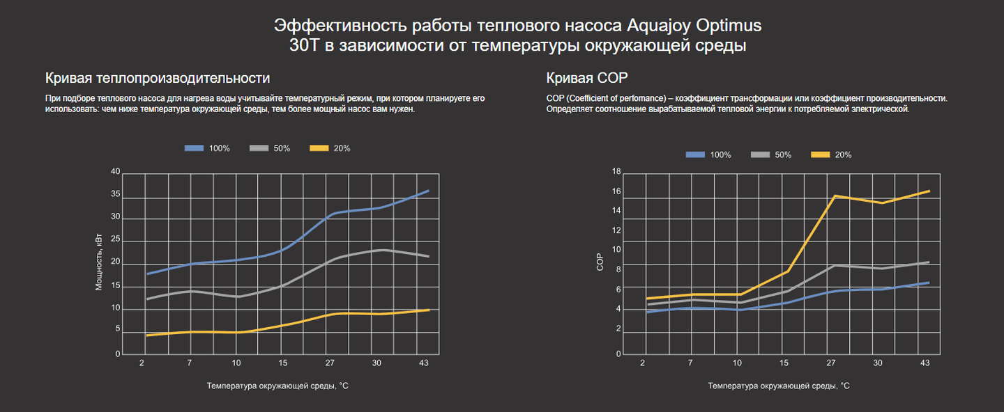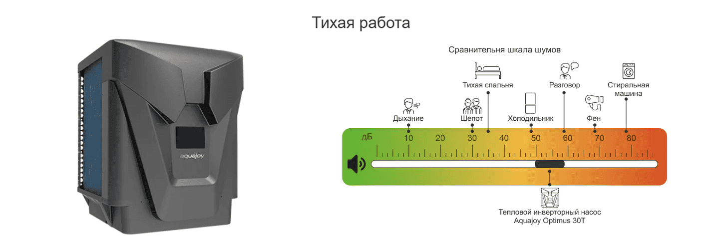 Aquajoy Optimus 30T — это мощное и интеллектуальное решение для нагрева и охлаждения воды в бассейнах объемом от 80 до 150 м³. Полноинверторный компрессор в сочетании с оптимизированным вентилятором обеспечивает высокий коэффициент производительности (COP) — в 1,5–2 раза выше, чем у стандартных моделей, сохраняя при этом до 15 кВт тепловой мощности, что гарантирует максимальную энергоэффективность и заметную экономию энергии.