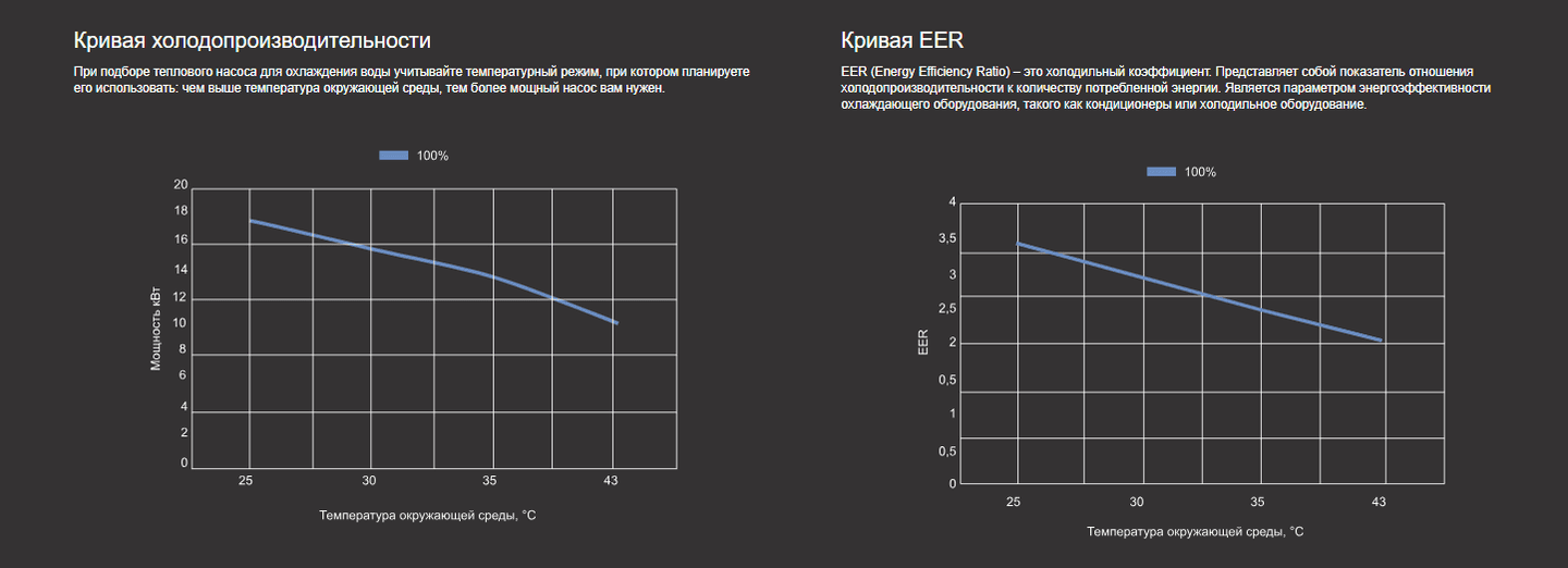 Надежность работы гарантирует компрессор Mitsubishi, который эффективно функционирует при температуре наружного воздуха от +15 до +43 °C. Система подогрева картера и поддона предотвращает гидроудары и обмерзание при низких температурах. Диапазон нагрева воды — от +9 до +40 °C, охлаждения — до +8 °C, что делает модель подходящей для круглогодичного использования.