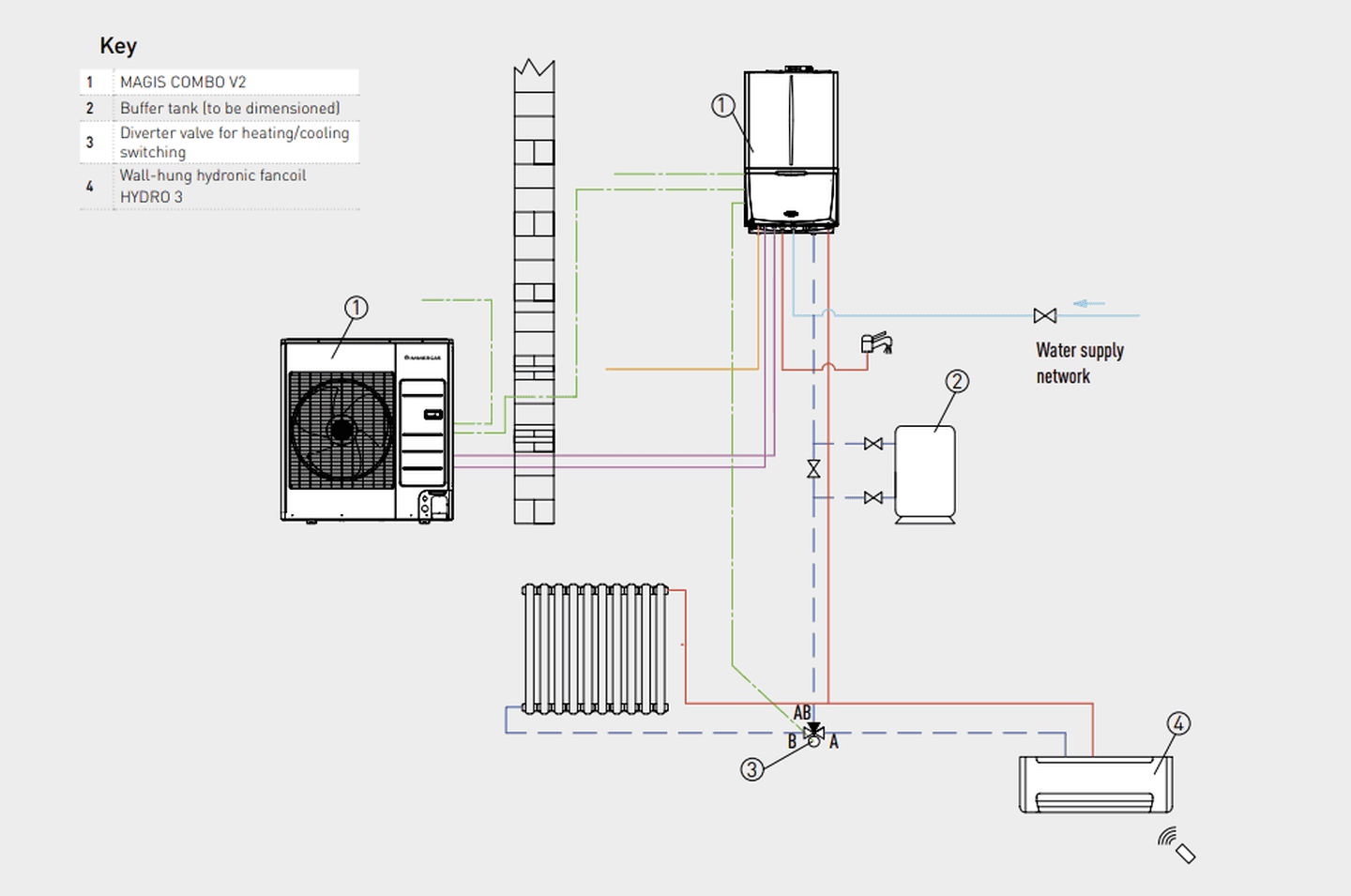 Пример конфигурации Magis Combo 9 V2 при замене старой существующей установки: Установка предлагается даже в случае замены существующего газового котла в системе с фанкойлами или радиаторами, которые работают при средней температуре.