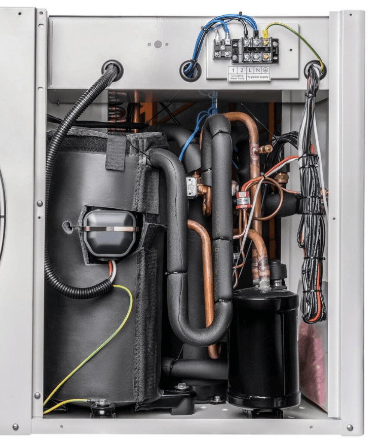 - Сжатие: Газообразный хладагент сжимается компрессором, повышая его температуру и давление. Этот процесс происходит в компрессоре, который расположен в моноблоке теплового насоса.