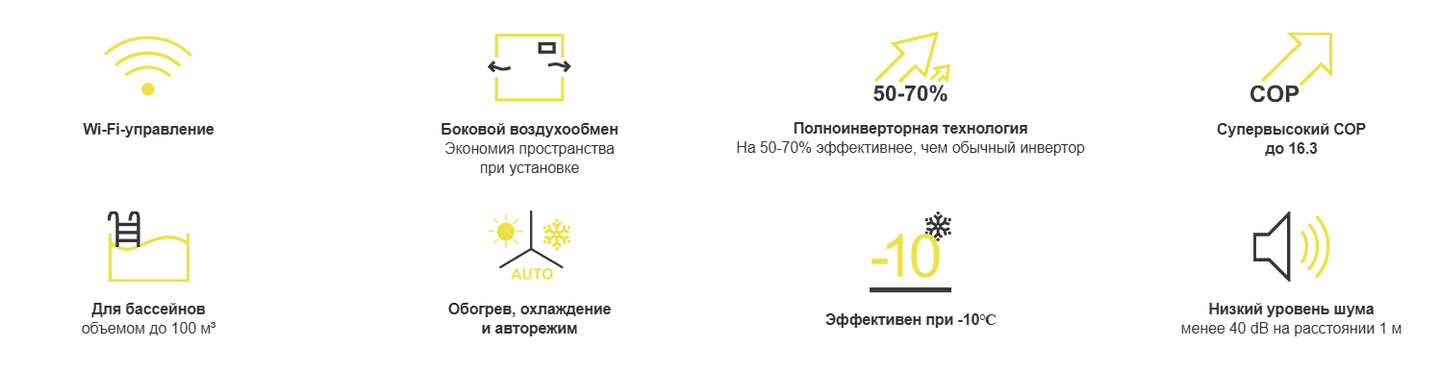 Благодаря боковому выбросу воздуха агрегат работает гораздо тише, чем стандартные модели с вертикальным или задним выбросом. Это снижает уровень шума на 4–6 дБ и минимизирует дискомфорт, что особенно важно при установке рядом с бассейном или жилым домом.