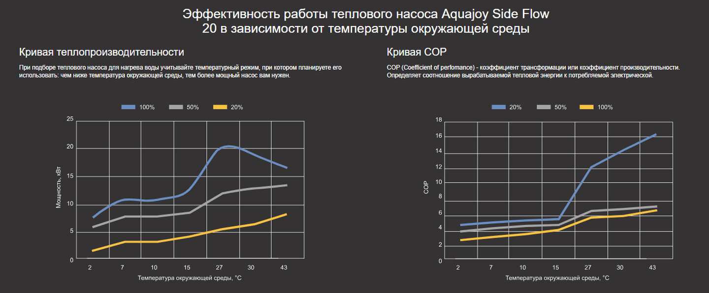 Максимальная тепловая мощность устройства составляет 20 кВт, а коэффициент производительности (COP) достигает до 16,3 — это один из самых высоких показателей в своём классе. Насос работает в диапазоне температур воздуха от -10 до +43°C, обеспечивая подогрев воды от +9 до +40°C, а также охлаждение в пределах +8 до +28°C. Это делает Aquajoy Side Flow 20 подходящим для использования круглый год.