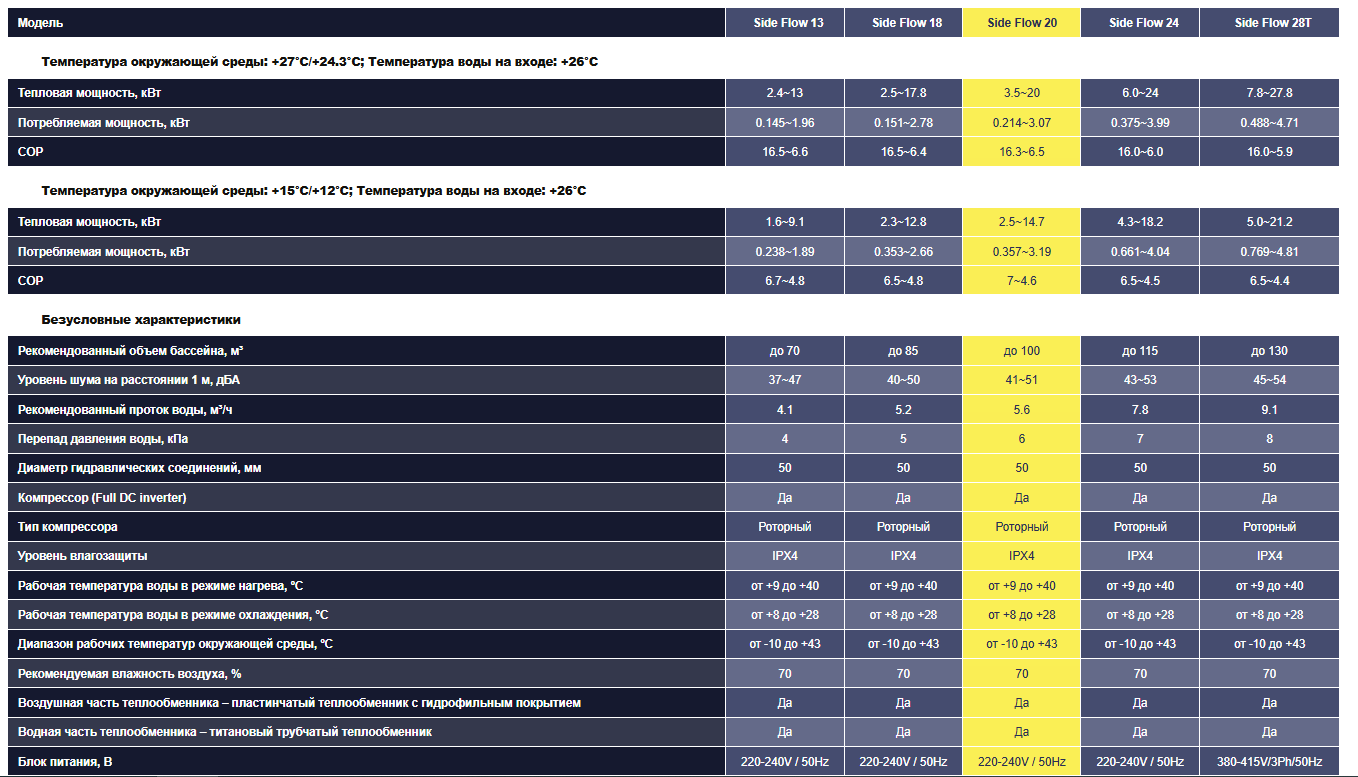 3. Тепловой насос для бассейна Aquajoy Side Flow 20 (20 кВт), инверторный, объем бассейна до 100 м³, -10°С/+43°С, 220В